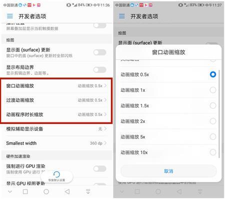 在华为手机中的开发者选项中,“窗口动画缩放”、“过渡动画缩放”以及“动画程序时长调整”的默认值都是1X,如果你想要进一步提升手机性能的话可以将这三个都调整为0.5X,这样的数值才会是手机最舒服的状态。