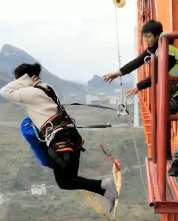 当天,共6名专业蹦极选手和6名蹦极爱好者从370米高的桥上跳下,感受了高空蹦极的惊险与刺激。
