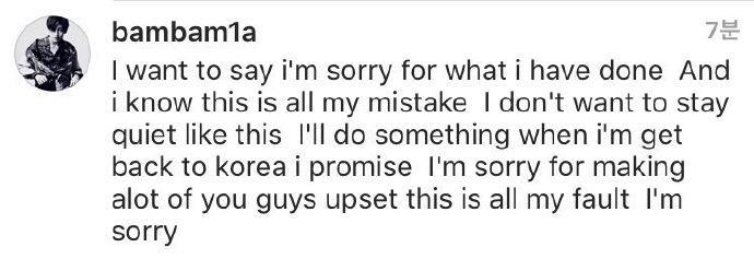 13日,BamBam评论INS一则表明心境:我想说,为我所做的事情感到抱歉,我也知道这都是我的错。我不想像现在这样保持沉默,我保证我回到韩国后会为此做些什么。让你们失望了我很抱歉,这都是我的错,我很抱歉。
