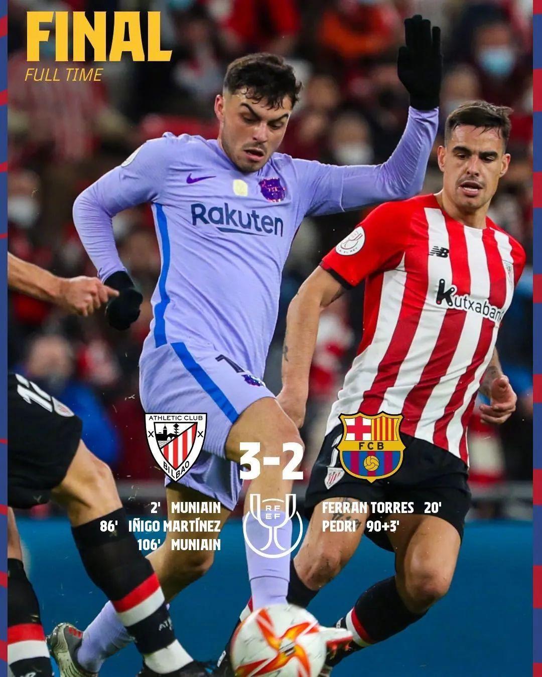 上半场穆尼亚因开场破门,费兰-托雷斯扳平。下半场伊尼戈终场前领先,佩德里绝平。比赛进入加时赛,穆尼亚因点射破门带走比赛。