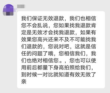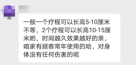 《中国消费者报》联系该店客服进行咨询,对方表示:“效果是肯定有的,一般一个疗程可以长高5-10厘米不等,2个疗程可以长高10-15厘米,使用时间越久效果越好,50岁以内都适用,年纪越小效果越好。”该客服还表示,此产品是纯中药外贴,无副作用,不反弹,且常年使用对身体没有任何伤害。