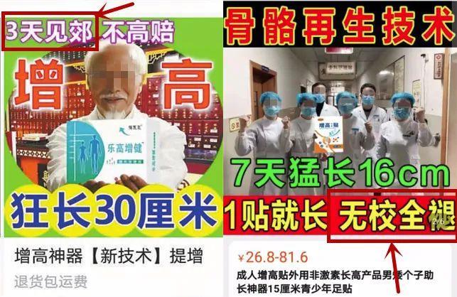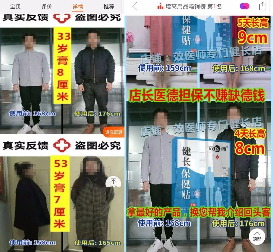号称“增高用品畅销榜第一名”的“效医师专门健长店”售卖的“效医师牌健长保健贴”宣称“增高新技术,当天就长,不高不收费,暴长30厘米”。在该商品的评价中,有留言说“半个月长了4厘米”“使用两次就长高了3厘米”;另外一家“优尚护理馆”销售的“风火贝康健长助长保健贴”宣称“可以帮助6-60岁年龄段的人长高,起步增长10厘米……”