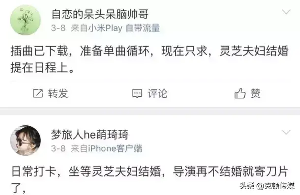 随着剧情的不断推进,最后的大结局如何也让她们期待爆棚,纷纷在评论区留言说“灵芝夫妇必须结婚”、“薛灵乔和田净植天生就是一对”。她们甚至给自己成立了灵芝夫妇催婚团,每天在微博“打卡”催婚,当然最后的大结局也让她们得偿所愿。