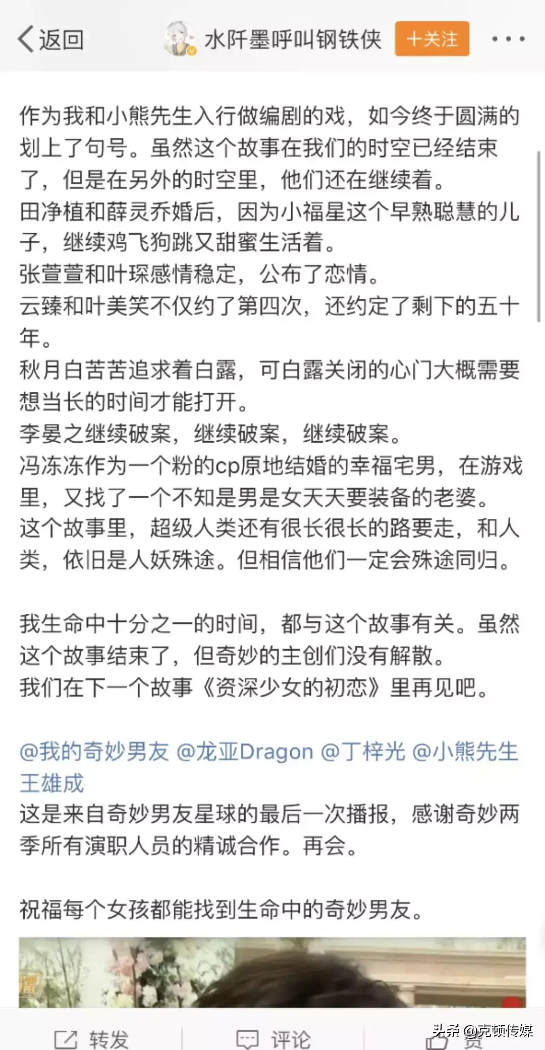 故事终有章,《我的奇妙男友2之恋恋不忘》今天就要大结局了,但正如编剧所说,在另外一个时空里,我的奇妙男友的故事还在继续,那里薛灵乔和田净植继续鸡飞狗跳的生活着,云臻和叶美笑开开心心的约会,李晏之还是查案查案查案,舅舅开始追求白露……他们美好的生活在继续,主创团队坚持做精品剧集的脚步也在继续,我们期待《资深少女的初恋》!