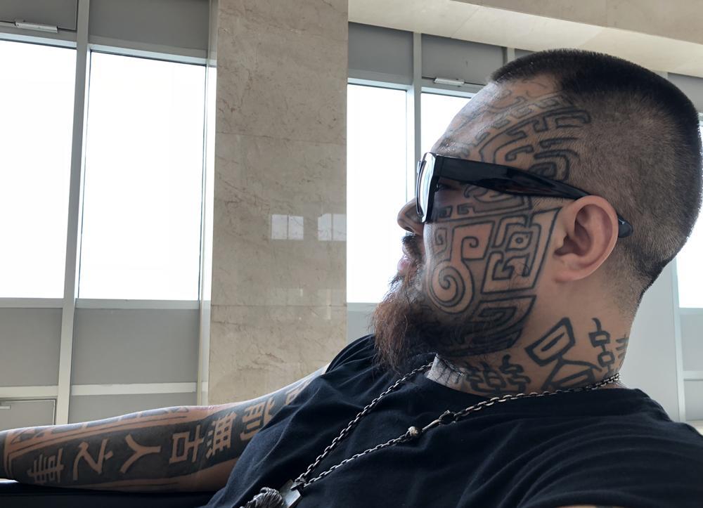 初见陈天骄,首先吸引记者眼球的确实是他面部的图案,看上去让人心生敬畏。仔细观察发现,在陈天骄的面部、脖子、以及手臂上遍布着各式各样的纹身,有书法字体,有图腾花纹……其中一处非常抢眼,在他的右手小臂上,有他自己的座右铭——做前无古人之事。