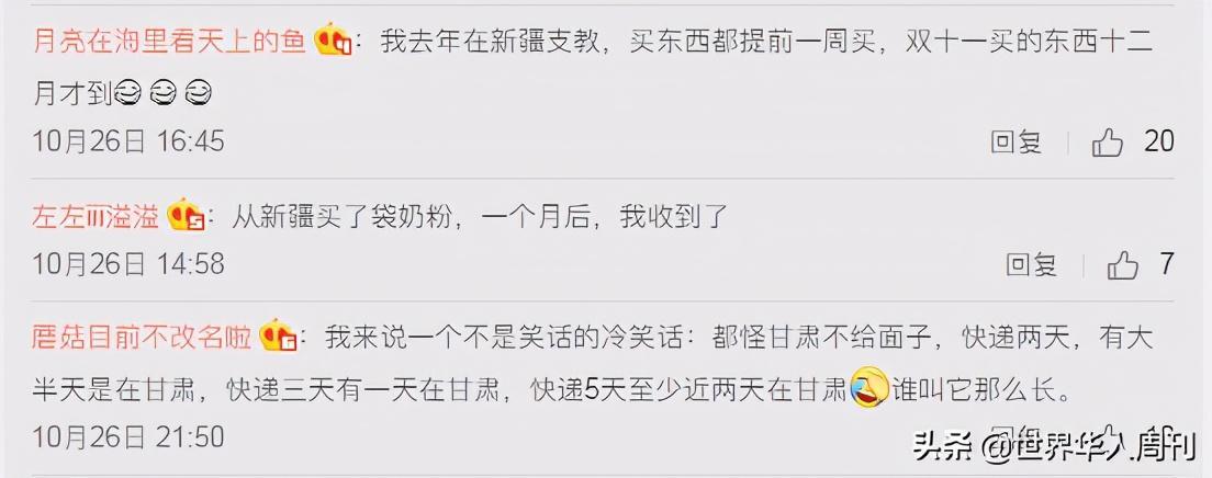 之前有一张某宝的截图,显示了从广东到新疆的快递费,价值几十元的东西,快递费要比物品还贵。