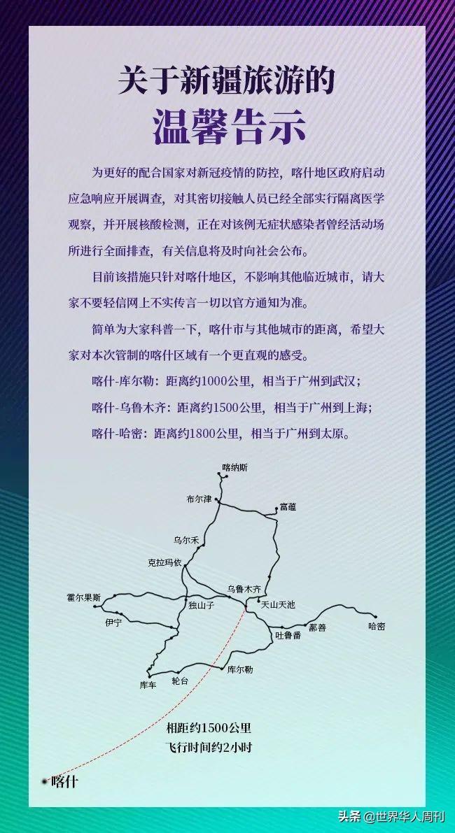 这则告示先是通过文字描述,说明了祖国应对疫情的迅速措施,同时还通过直观的手绘地图,详细介绍了喀什到其他城市的地理位置。