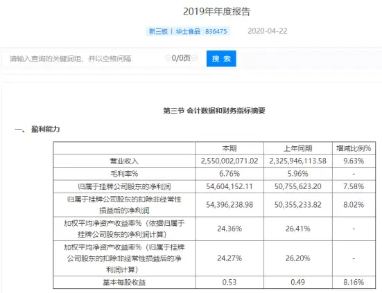 在网站上查找华莱士的企业信息,我们还能看到它近几年的盈利情况。古早数据暂且不谈,自17年以来,华莱士每年营业收入同比呈上升趋势,毛利率6%左右,每股收益虽有下跌,但整体表现良好。