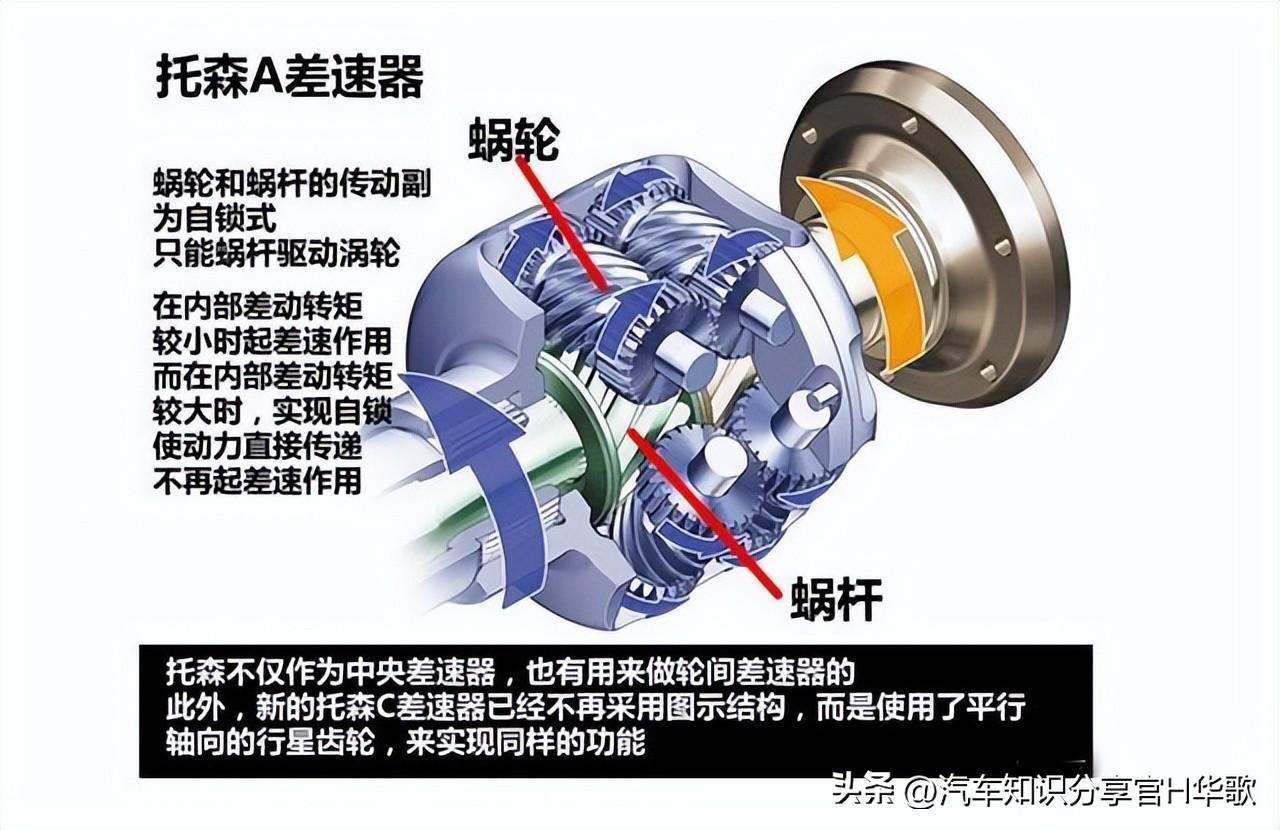 奥迪1986年开始使用的中央差速器是纯机械的托森差速器,核心结构是蜗轮蜗杆的结构。这种结构具有单向传递动力的特性,正常情况下分配50:50的动力。