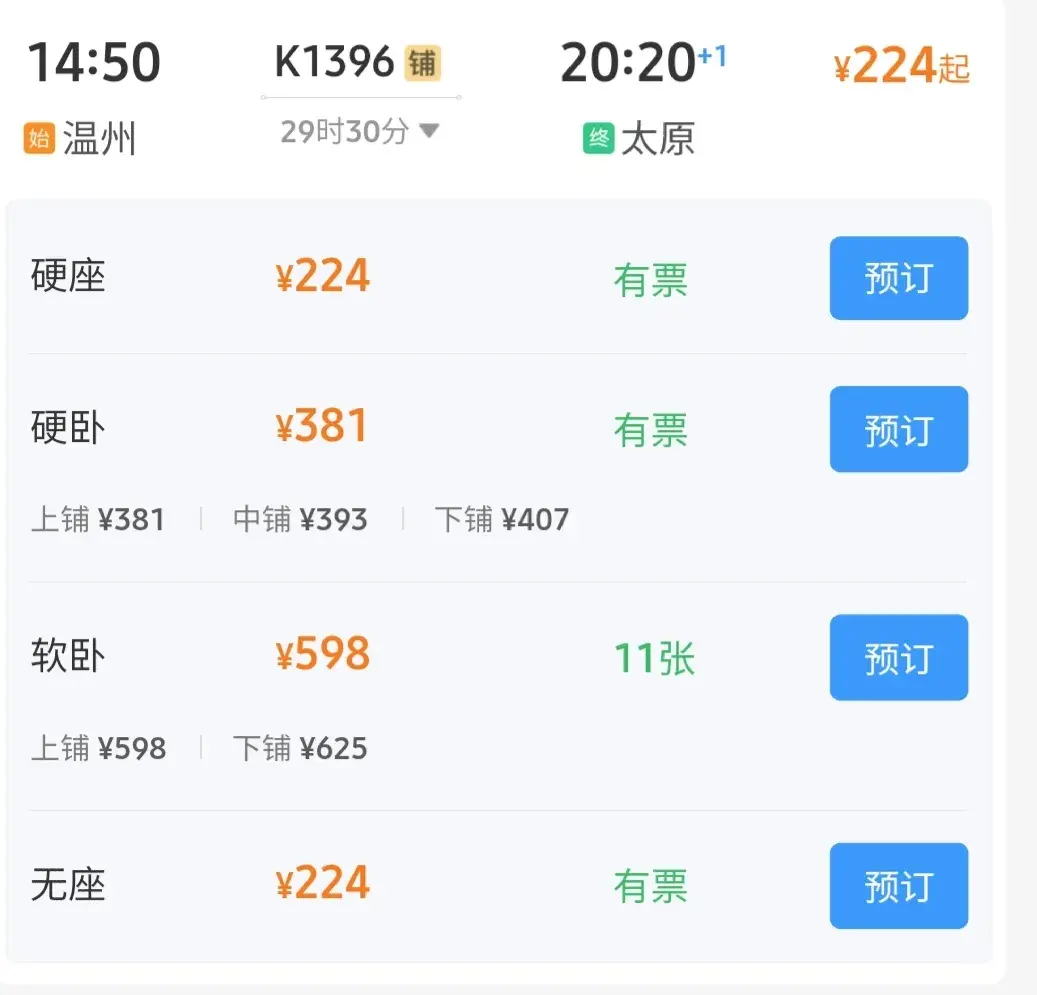 K1396次列车,日常跑一趟温州到太原的行程,尽管路途遥远,然而其全程的票价,还是非常贴合老百姓心里预期价位的。