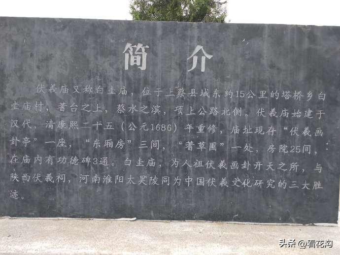 13.上蔡县的著名景点-白圭庙。位于上蔡县城东15公里处的白圭庙村,始建于汉代,宋时称羲皇城,明时称羲和寨。相传人文始祖伏羲南游至古蔡时发现灵龟出没,在此始创先天八卦,肇启华夏文明,遂名此地为蔡。后人为感念兴建伏羲庙,后又称白圭庙,又名白龟庙。祠内现有伏羲殿三间,伏羲大殿前蓍草园一圃,龙王殿三间,禅房九间,东厢房三间,西侧有伏羲画卦亭一座。画卦亭建于高2米的八角形砖台之上,亭为八角攒尖琉璃瓦顶,青石圆柱,分立于八角砖砌台基上。亭檐下刻有八字,象征八卦。