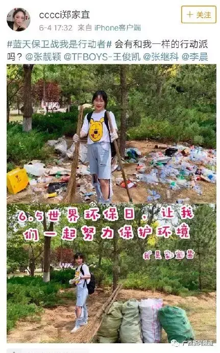 当天, 一名叫@cccci郑家宜 的女网友,在微博发了一组在公园捡垃圾的前后对比照,还打上了“蓝天保卫战我是行动者”这样的标签 。