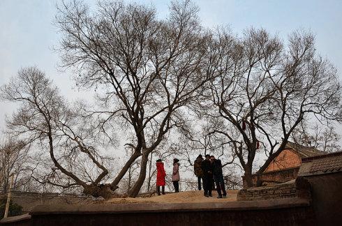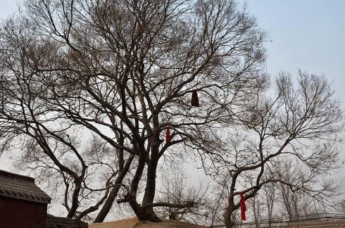 据说,北宋时此树就已经在此生根,一树顶千秋,枝繁叶茂。记得那年我去的时候,树叶已经落尽,枝条曲折蔓延、密密麻麻,枝干屈曲无一直者。树后已经通了水泥公路,树的周围也围上了朱红色的围墙。
