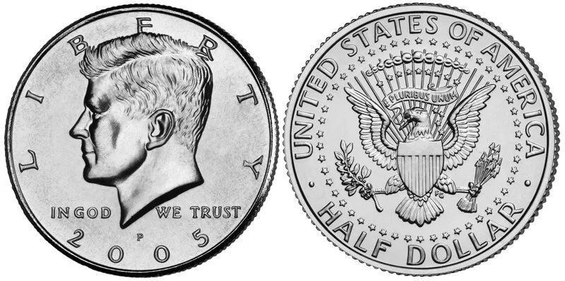 50美分又称Half Dollar,50美分比较少见,主要用于收藏,但是也可以在市面上流通。常见正面图案为美国第35任总统肯尼迪,1963年在任期间遇刺身亡。背面是鹰、盾牌、橄榄枝和13支箭。