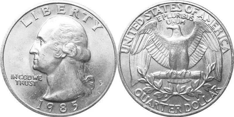 25美分又称quarter,常见正面图案为美国第1任总统华盛顿,我们熟知他就是通过华盛顿与苹果树的故事,背面图案不固定,美国各州的背面图案都不一样。