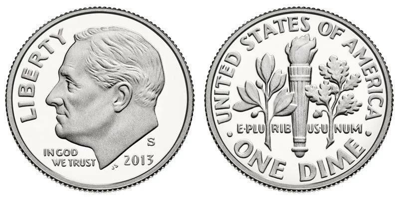10美分又称Dime,常见正面头像为美国第32任总统罗斯福,也是到目前为止,唯一一位连任四届的美国总统。背面图案是火炬、橄榄枝与橡树枝。