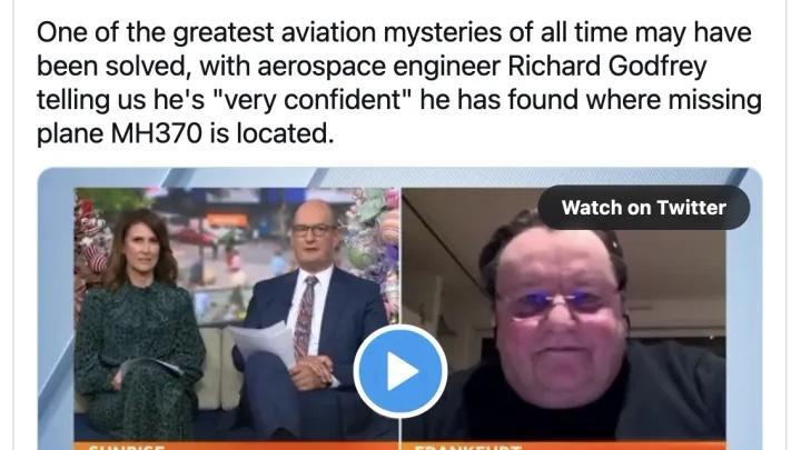 这个新闻的源头,出自澳大利亚七号台的一档名为Sunrise的新闻栏目。一位航空专家Richard Godfrey声称自己找到了MH370的位置,并对此结果“非常自信”:根据英国泰晤士报的说法,Richard是MH370独立搜索小组的创始人之一,专家组成员。通过一项称为弱信号传播的新测绘技术精确定位到了飞机残骸的位置。他将其比作:一堆跨越地平线,延伸到地球另一半的“绊线”。当有飞机飞过的时候,“绊线”就会被扰动。