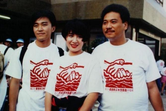 这张珍贵的照片是:1991年的华东水灾,周星驰在现场做志愿者与吴孟达、吴君如的合照,三位都是喜剧界的大咖,其他两人面对镜头时笑得很开心,而周星驰却像有心事一般,客气的微微一笑。