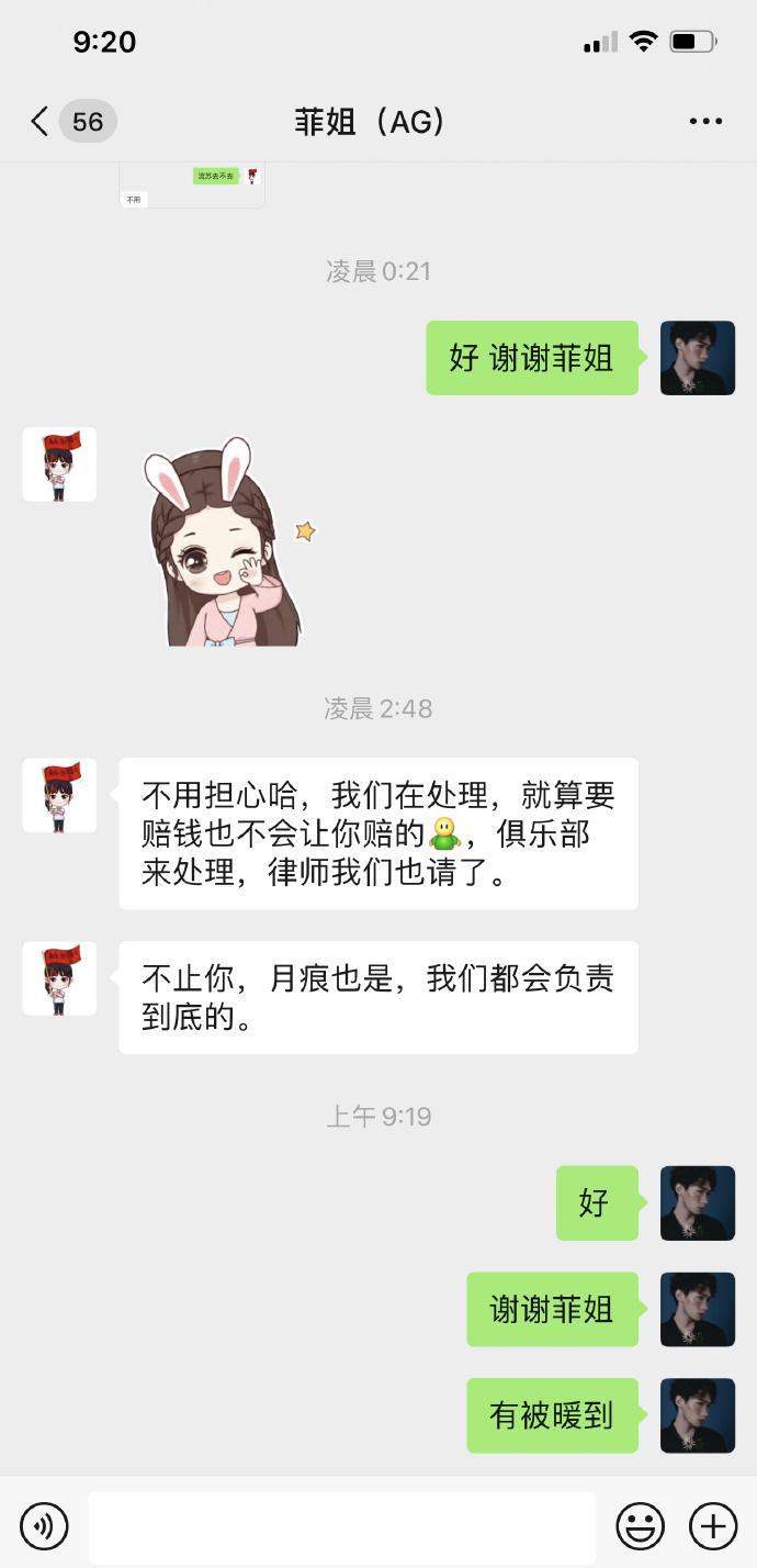 对于任何人来说,这个违约费用不是一个小数字,流苏接到这个通知,内心肯定也很慌,在这个时候他想到了菲姐,菲姐在凌晨2.48分回复流苏,告诉他不用担心,这个事情俱乐部会处理,就算要赔钱也不会让选手赔的,让流苏大可放心。
