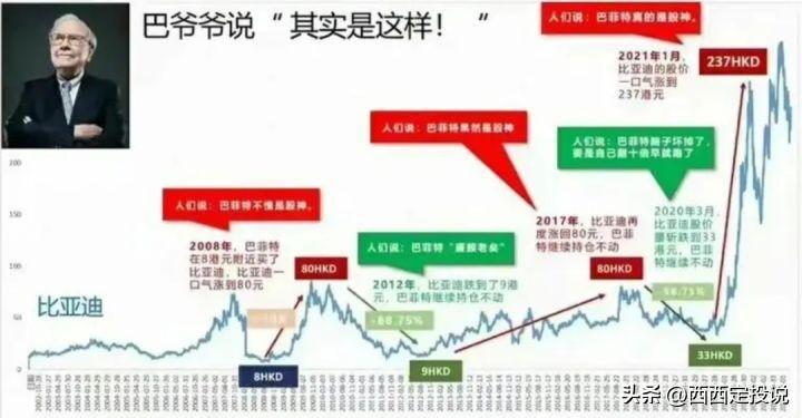 其实比亚迪股票直到2019年底还停留在30多港币附近徘徊,而巴菲特浮盈并不多。但是这两年新能源车产业暴发,比亚迪车大卖,这两年股价大幅上涨。