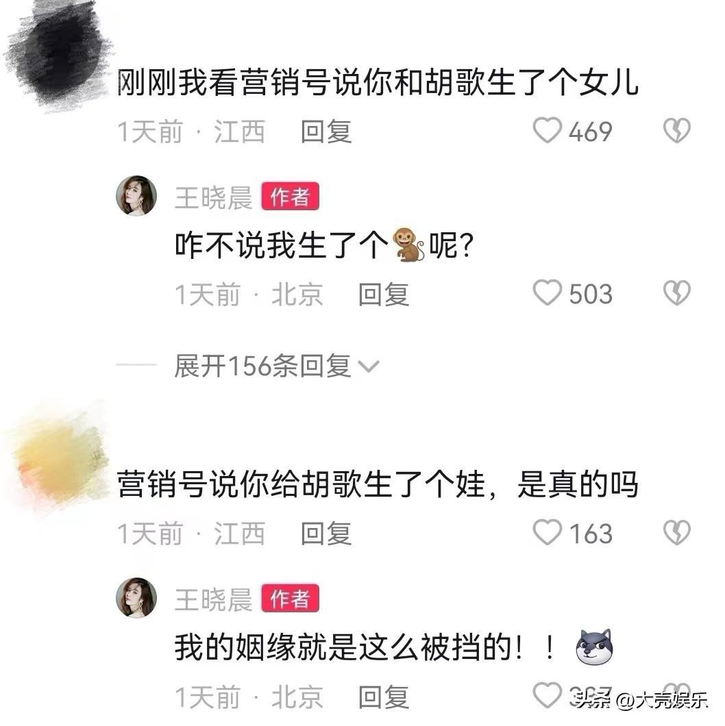 没想到王晓晨却搞笑回应:“咋不说我生了个猴子呢?”王晓晨还说她的姻缘就是这么被挡的,王晓晨间接否认了她和胡歌的恋情,生女儿一事更是子虚乌有。