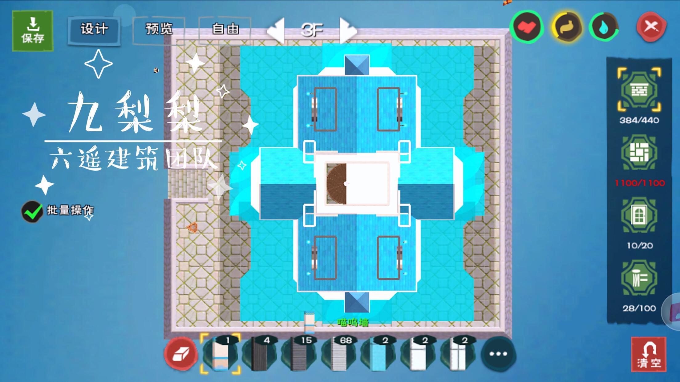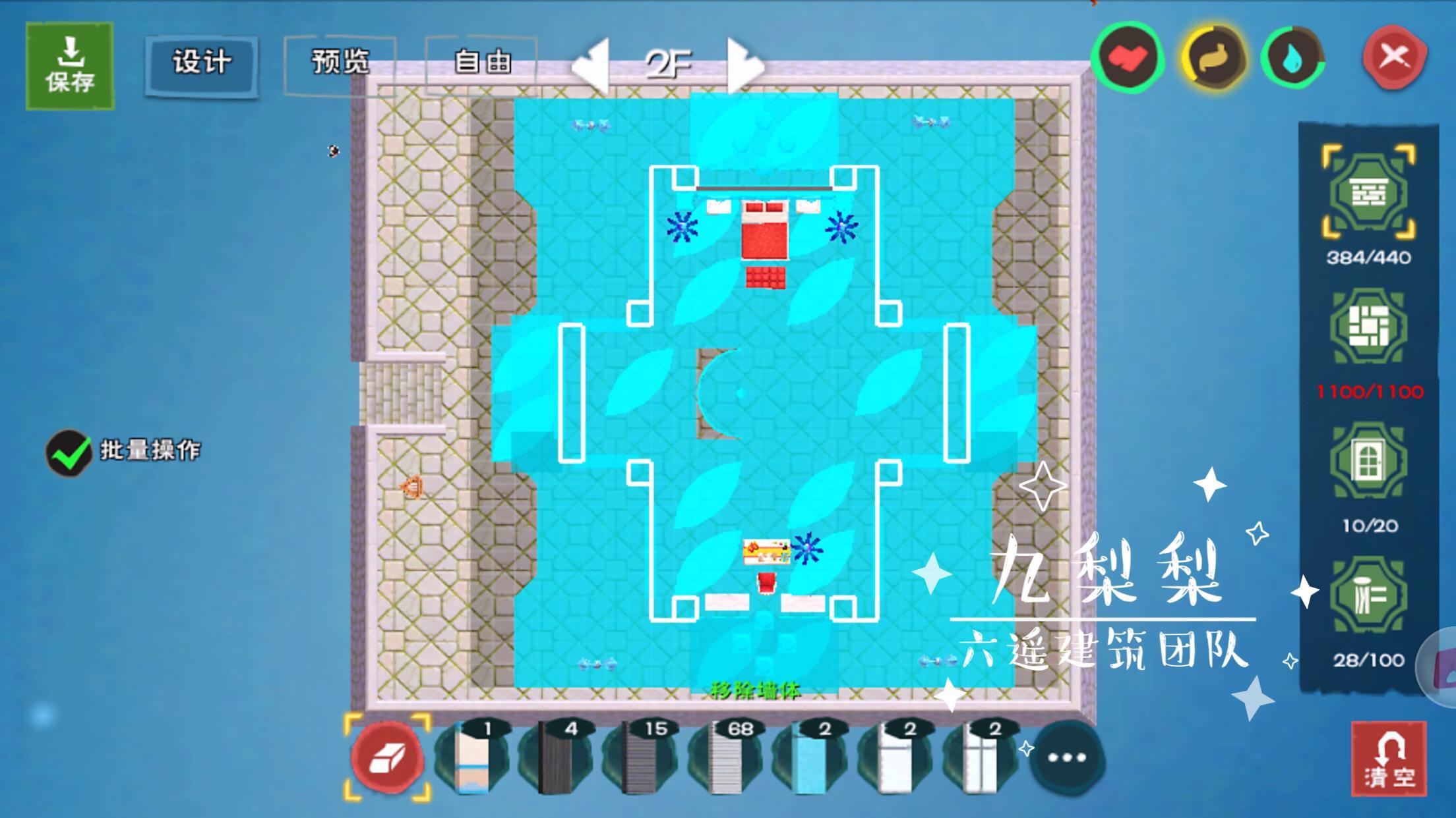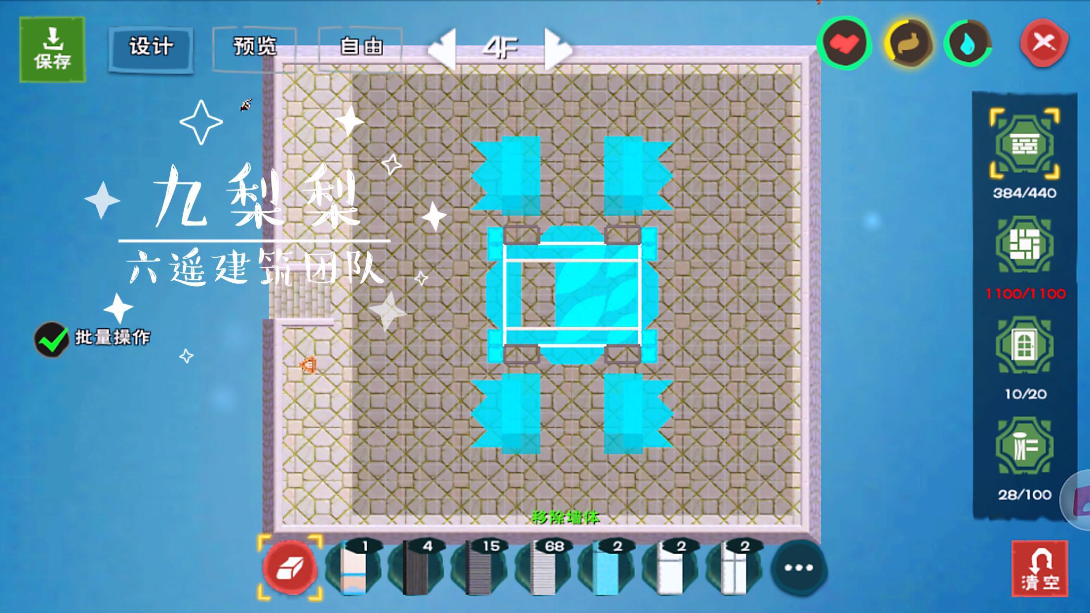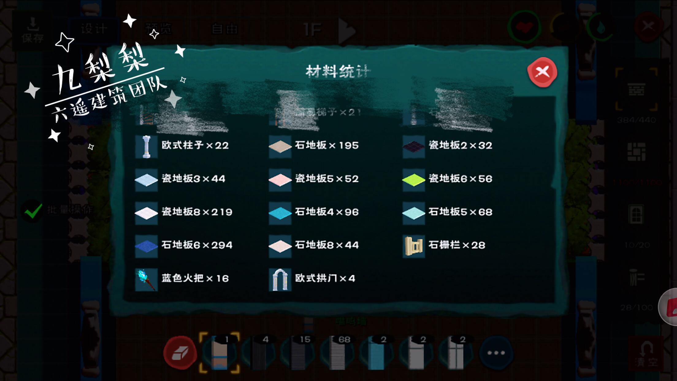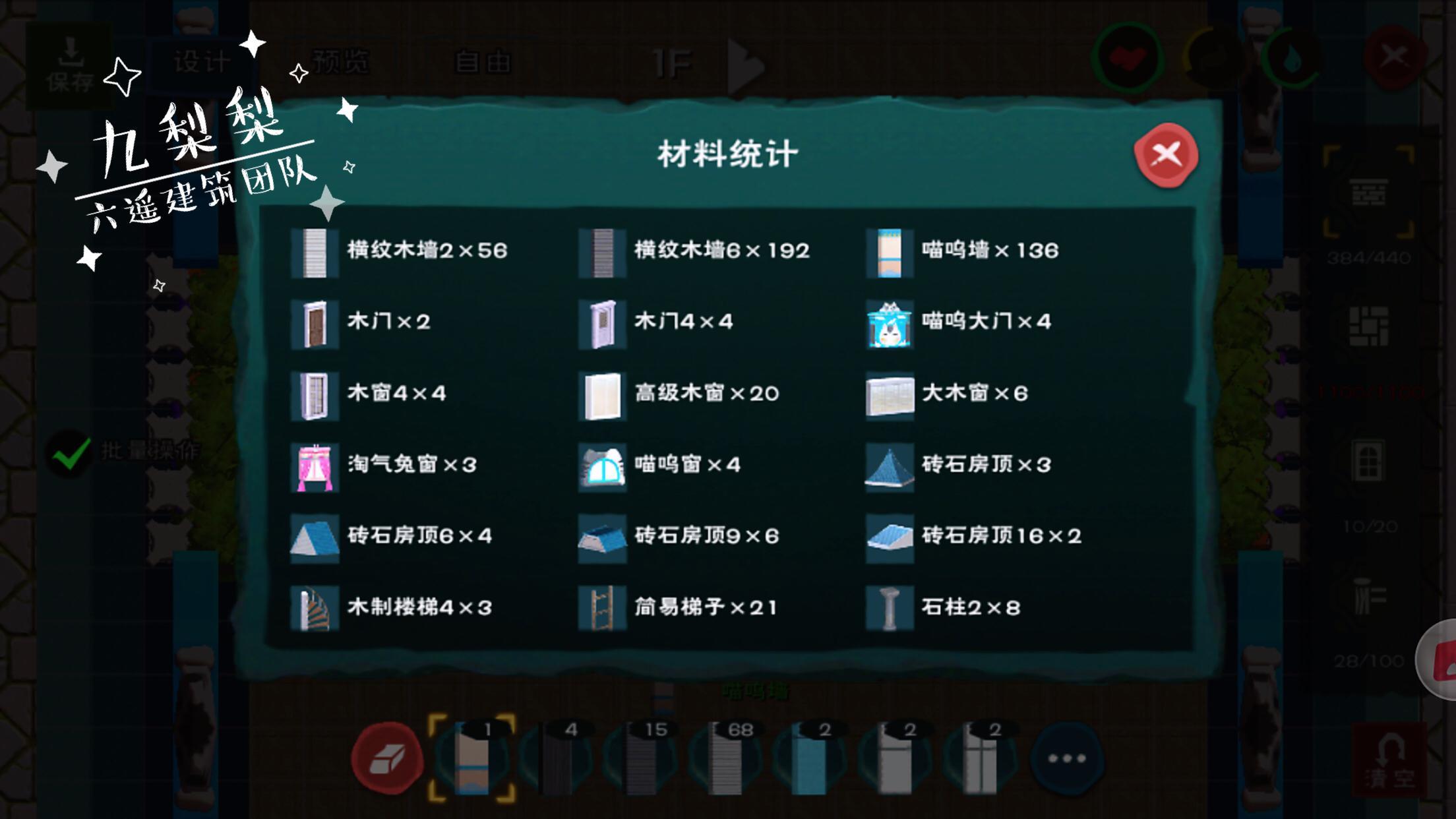 墙板总数384,在我最初的设计中,所有的墙都是喵呜墙,于是需要5760木板,也就是同等数量的树脂,这还仅仅是墙,后续还有大门、屋顶、高级木窗、地板等等等等,一想到这里,我觉得浑身的肝都在颤抖,于是用了一部分木墙代替,这才把墙板部分的树脂数量,控制在2000出头。