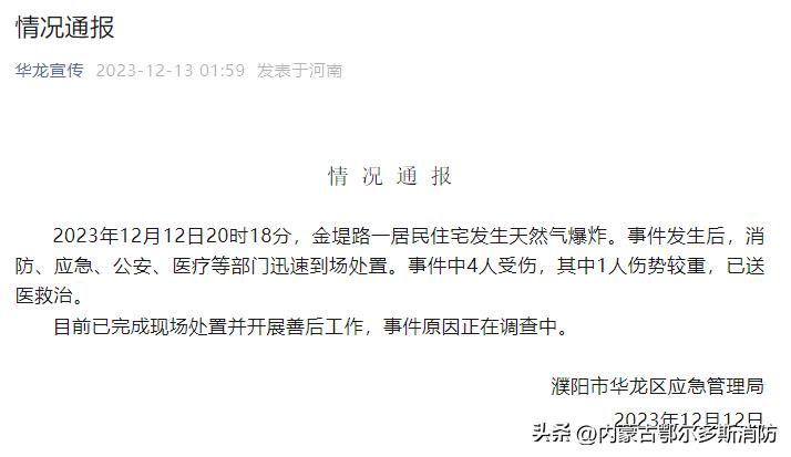 濮阳一住宅燃气爆炸,致4人受伤,其中1人重伤