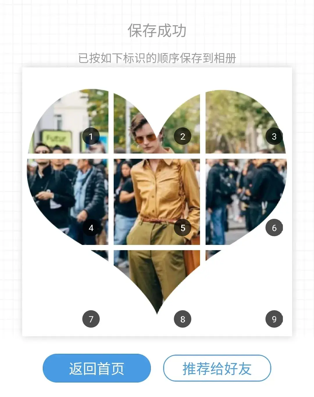 保存图片的同时会生成带数字顺序的图片,然后根据这个顺序来发,朋友圈就会组成九宫格形状。