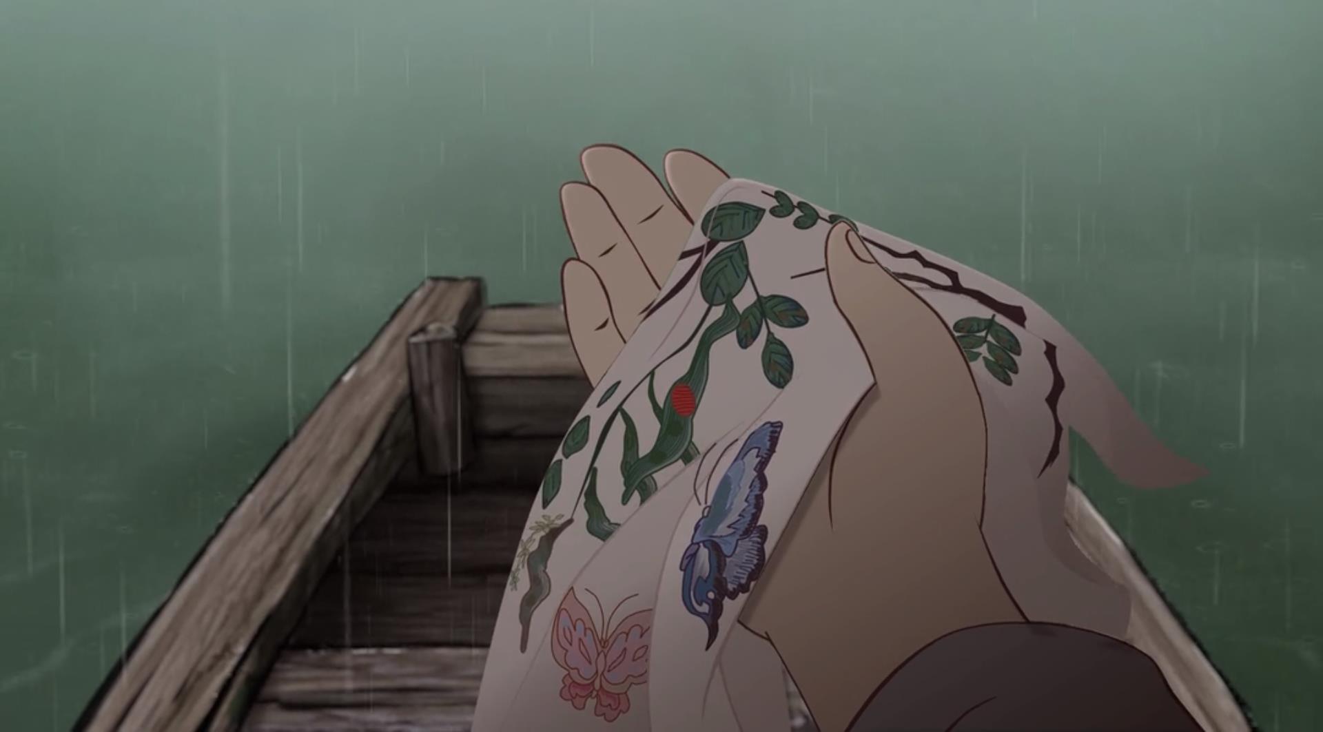 六娘出嫁,书生船走。临走,秀才带走了六娘绣的红豆手帕 。
