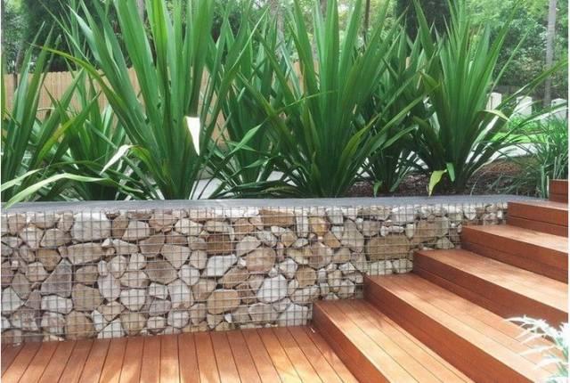 挡墙石景一般运用堆砌手法,通过对石块的趋势面选择拼接形成规整的石景墙。新材料的加入,使原本枯燥乏味的单一挡墙石景提升到更高层面的艺术行列中。石笼是装满石块或其他一般的石料的金属笼子或箱子,被用作挡土墙或其他户外墙壁。笼子最常采用不锈钢、镀锌或粉末涂层的钢丝网板,再用螺旋粘合剂或环紧固件把它们连接到一起,形成一个矩形的形状。笼壁不仅有明显的美学特质,它也有实际的吸引力。炎热的夏日,投射在墙上的植物绿荫能帮助冷却空间,带给人凉意。而且,选择不同形状,大小、颜色的石块,可以在墙上打造出有趣的图案,是园林细部装饰的精妙设计手法。