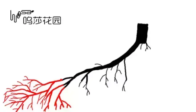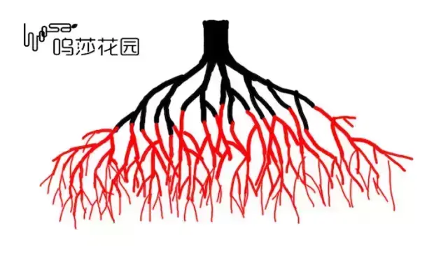 好了,下面开始实战的内容。下面的图解中,红色的根系是建议修掉的部分,如上文所说,这并非必须遵守的金科玉律,只是一个建议而已,如果你有本事在种植时仔细的把根系分散开,完全可以修得更少。