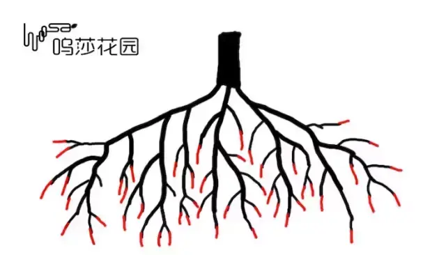 常常见到这样的根系,歪在一边很不对称。对于这样的根系,应该毫不留情的修掉,不管修掉的这部分有多么发达,都不能留情。这样才能帮助距离主干更近的地方发出新根来。这些位置更近的新根会有更高的吸水效率的。