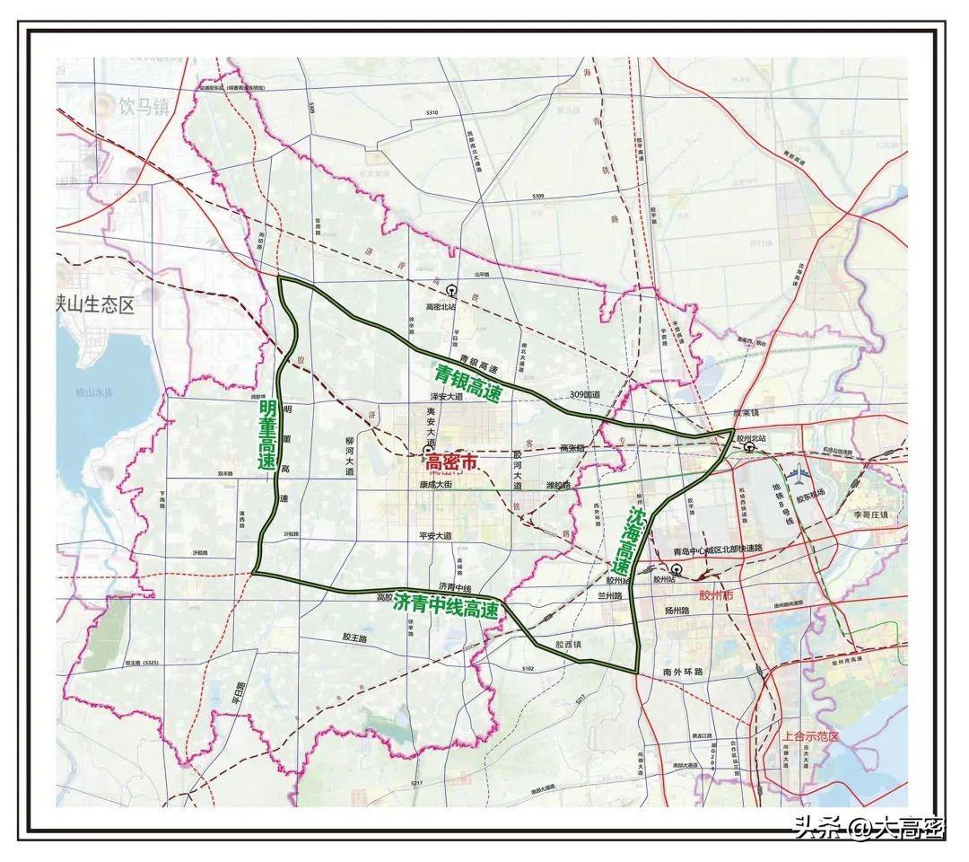 高密交通区位优势明显,胶东国际机场距市区仅有20分钟车程,境内胶济电气化铁路、济青高铁、青银高速公路纵横贯穿,高等级公路四通八达,“北青银、南中线、西明董、东沈海”高速四环加快形成,“9个高速出入口、全域20分钟进高速”,“陆空铁港”立体化大交通格局全面构建。