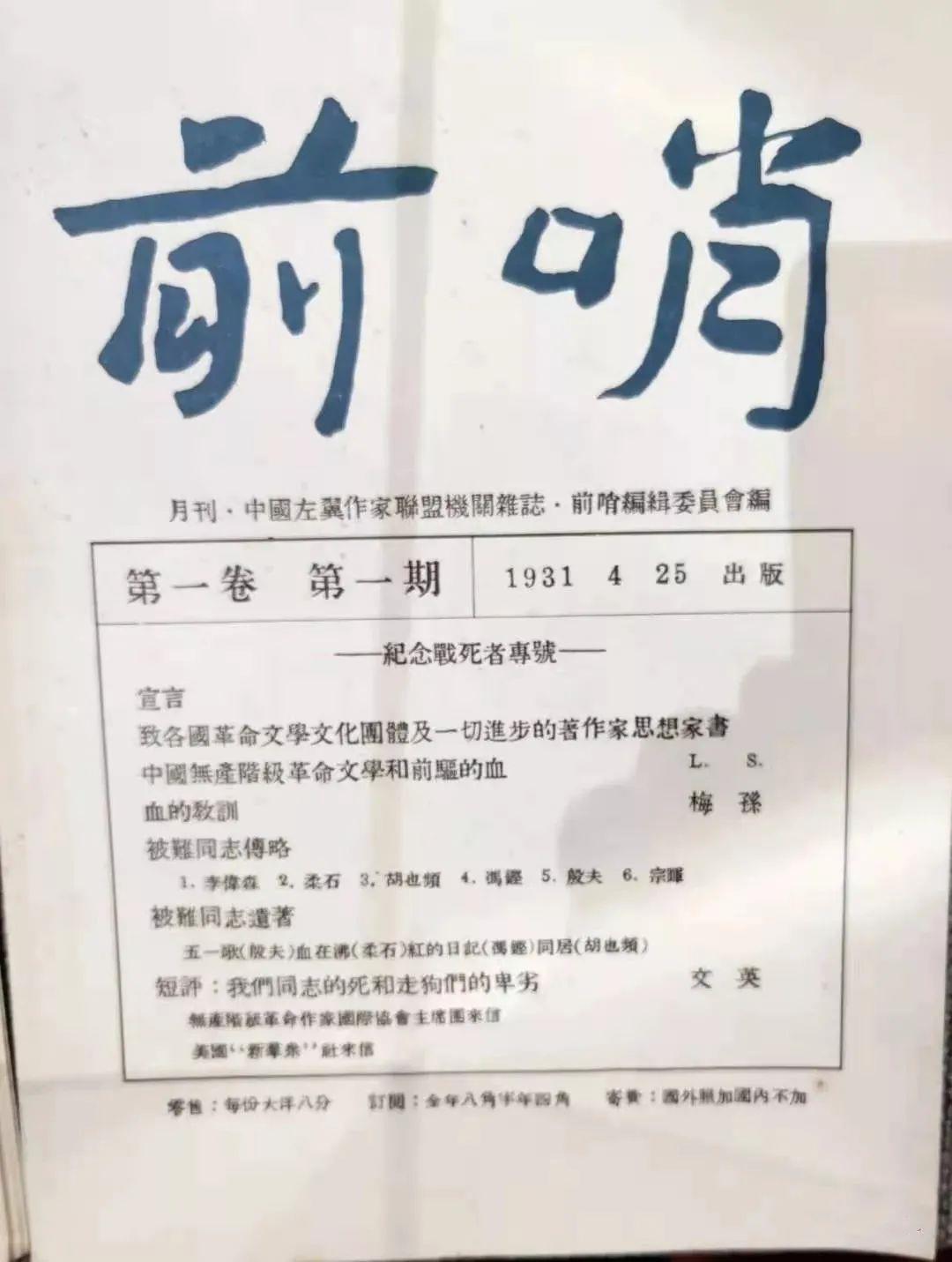 1931年4月25日 ,中国左翼作家联盟机构杂志《前哨》月刊发表了《纪念战死者专号》