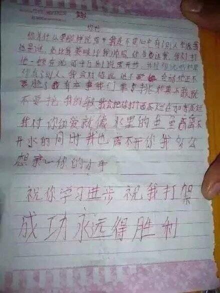 这封情书倒是有点“黑道老大爱上我”的风格,字里行间都是“暴力”风,直截了当的在信中表示“谁要是敢挖我的敏,就会把他打的西瓜烂”。最后,这位“混社会”的小学生文笔倒是不赖,还知道用鱼水不分离形容他们之间的爱情。只是,落款祝福让人陷入沉思,“祝我打架成功永远的胜利”真是一位执着梦想的小学生。
