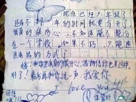 情书,是一种表达相思、传递爱恋的暖心方式。它让苦于暗恋的人,勇敢地表达出自己的想法。它让彼此心仪的人,明白了对方的心声。看过上面小学生写的情书,宛若看到一个个纯真的爱情。只是,笔者认为,小学生最大的任务是学习,“写情书,谈恋爱”对于小学生来说最好不要有。不过,家长如果发现自己的孩子可能“早恋”了,也千万不要采取强行介入和拆散的方式。