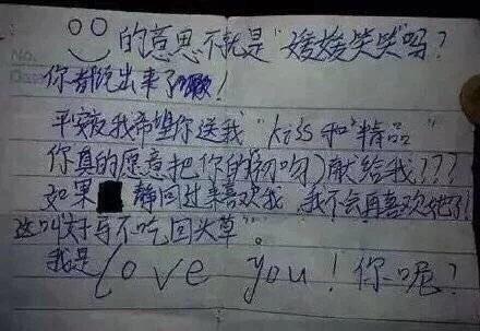 这封小学生情书真是充满了“野性”的爱情,小小年纪已经在期待平安夜时,女生会献出自己的初吻。至于情书中与“初吻”并列出现的“精品”是什么,还真是一个值得思考的问题?毛都没有长齐的小屁孩们,难道还有更加出格的想法?同学们,你们认为“精品”是什么?