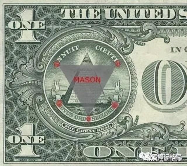 一美元纸币的背面上加印了美国国徽背面图案,有六个点形成正六角星,并出现共济会的缩写。纸币和国徽上也有共济会的重要符号“全视之眼” (就是那个三角形里的眼睛)和未完成金字塔(没有顶石的金字塔)。