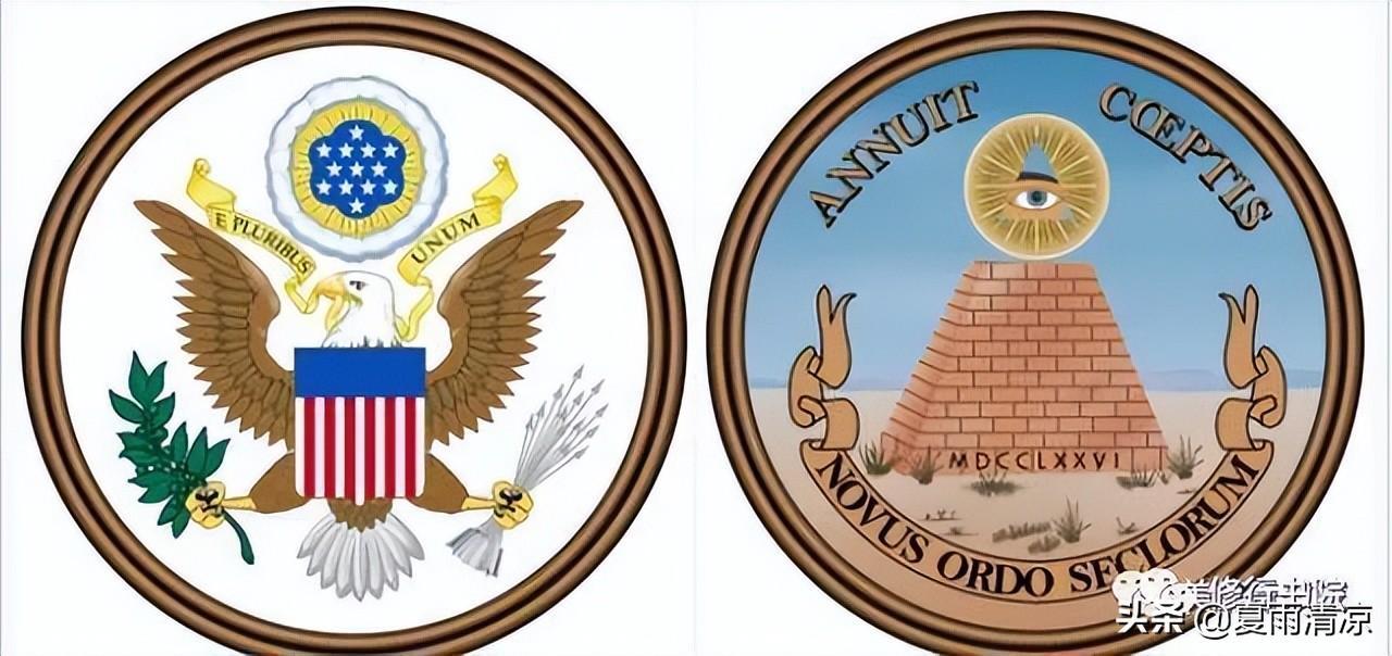 美国国徽的正面和背面,正面还比较正常,背面和一美元印记一样,全是共济会的象征