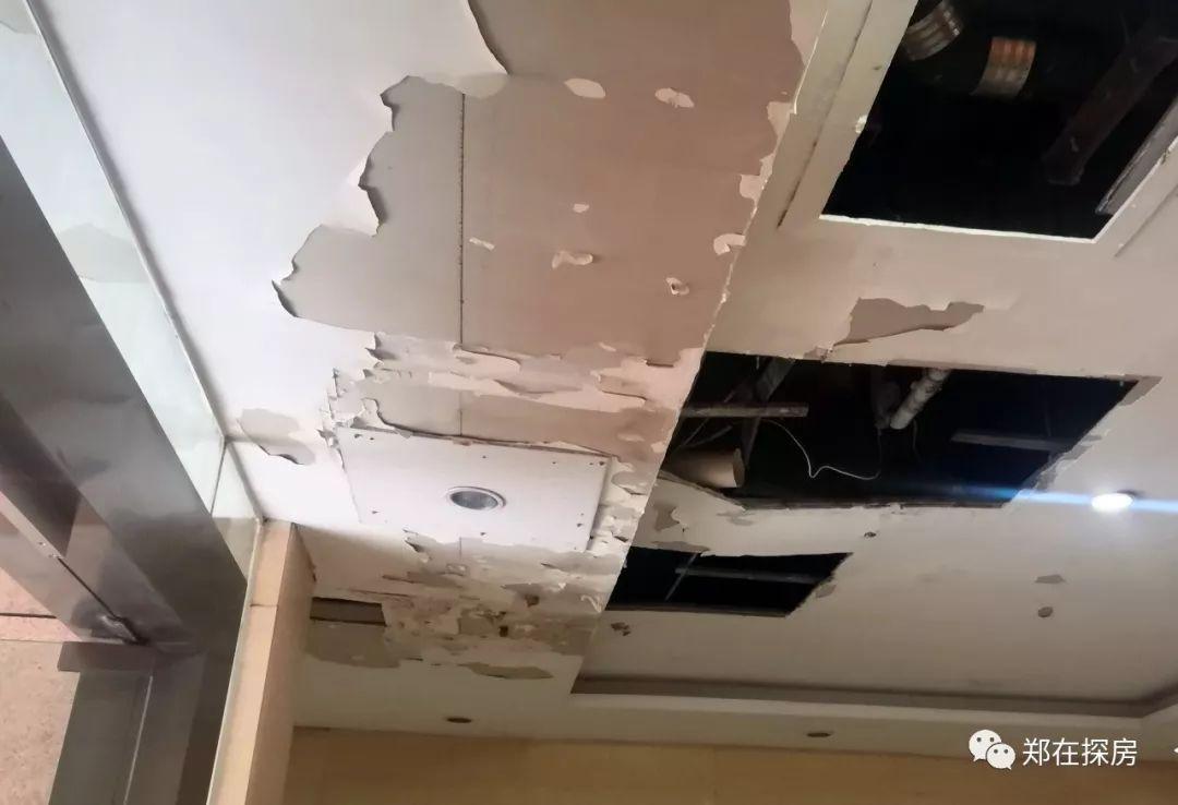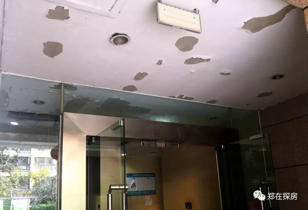 单元大厅吊顶的乳胶漆成片脱落,门口处吊顶受潮脱落,检修口全部呈打开状态,没有盖板!