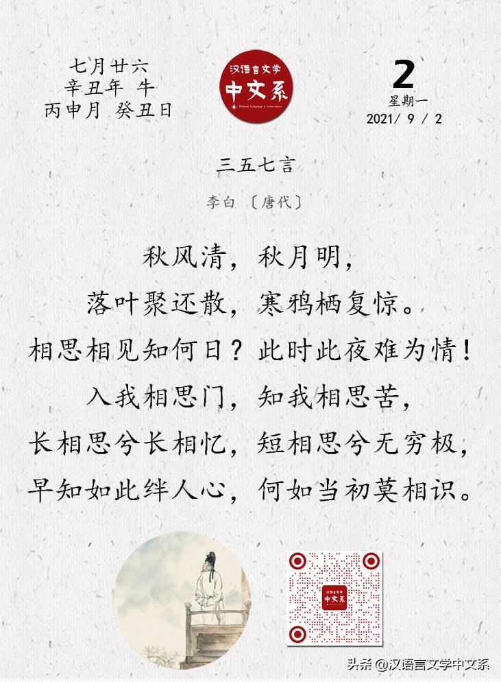 《三五七言》是唐代大诗人李白创作的一首诗。此诗写在深秋的夜晚,抒情主人公望见了高悬天空的明月,和栖息在已经落完叶子的树上的寒鸦,主人公以寒鸦自比,表达了无限惆怅的心情。这是典型的悲秋之作,秋风、秋月、落叶、寒鸦,烘托出悲凉的氛围,加上诗人奇丽的想象和对内心的完美刻画,让整首诗显得凄婉动人。全诗风格凄婉,意境悲凉。在形式上,此诗像一首小词,具有明显的音乐特性,应是一篇偏重作品形式特征的席间唱和诗。