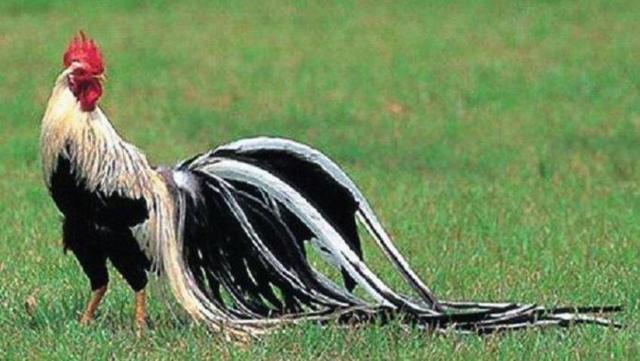 日本用人工杂交培育成的长尾鸡,尾羽的长度十分惊人,一般长达6~7米长,最长的记录为1974年培育出的一只,为12.5米。如果让它站在四层楼房的阳台上,它的尾羽则可以一直拖到底楼的地面上,因此也是世界上最长的鸟类羽毛。