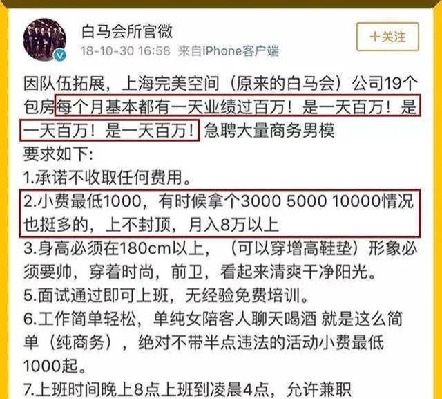 早年间它的官微曾发过一条招牌广告,因队伍扩大,急招大量商务男模,要求身高以上必须要帅,会穿衣,打扮时尚,前卫。而工作内容则是陪女客人喝酒,纯商务活动,不带半点违法内容,小费最低1000起。