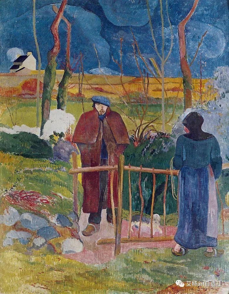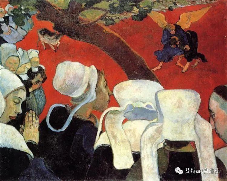 高更游历了马提尼克岛、巴拿马和法国地区布列塔尼。1888 年第二次访问布列塔尼的艾文桥期间,高更与后印象派艺术家并肩工作埃米尔伯纳德. 他们富有成果的相遇造就了高更开创性的画作布道后的异象:雅各与天使摔跤(1888 年)。在这幅画中,高更创造了两种现实的综合:布列塔尼妇女的日常生活和她们对圣经事件的看法。他用了这个词综合论描述他的作品是因为他旨在综合对象的外观、艺术家对对象的情感反应以及线条、形式和颜色的审美考虑。在接下来的几年里,他在布列塔尼和巴黎之间旅行,并加入了象征主义者移动。