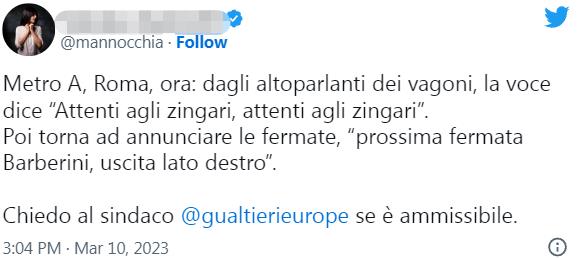 然而昨天,罗马地铁A线的列车员在进行报站广播时直接点名说道:“前方到站巴贝里尼站,开右侧车门。当心吉普赛人,当心吉普赛人(Attenti agli zingari)。”一名正在乘坐地铁的意大利记者在听到这样的播报时倍感震惊。她直接在社交平台推特上发帖质问罗马市长瓜尔蒂耶里这种用语是否得当。