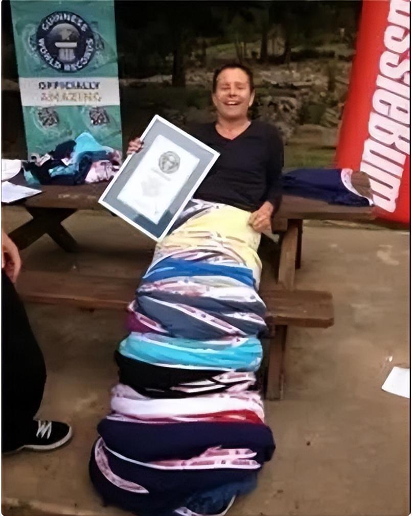 一个非常无聊的美国人,竟然挑战了同时穿最多内裤的纪录,他成功穿了266条内裤。由此可见她是多无聊。