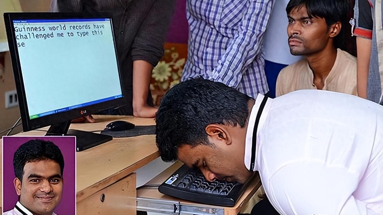 一位来自印度的人在电脑键盘上用鼻子打字,用时46.3秒完成了一句话,创造了令人难以置信的吉尼斯世界纪录。