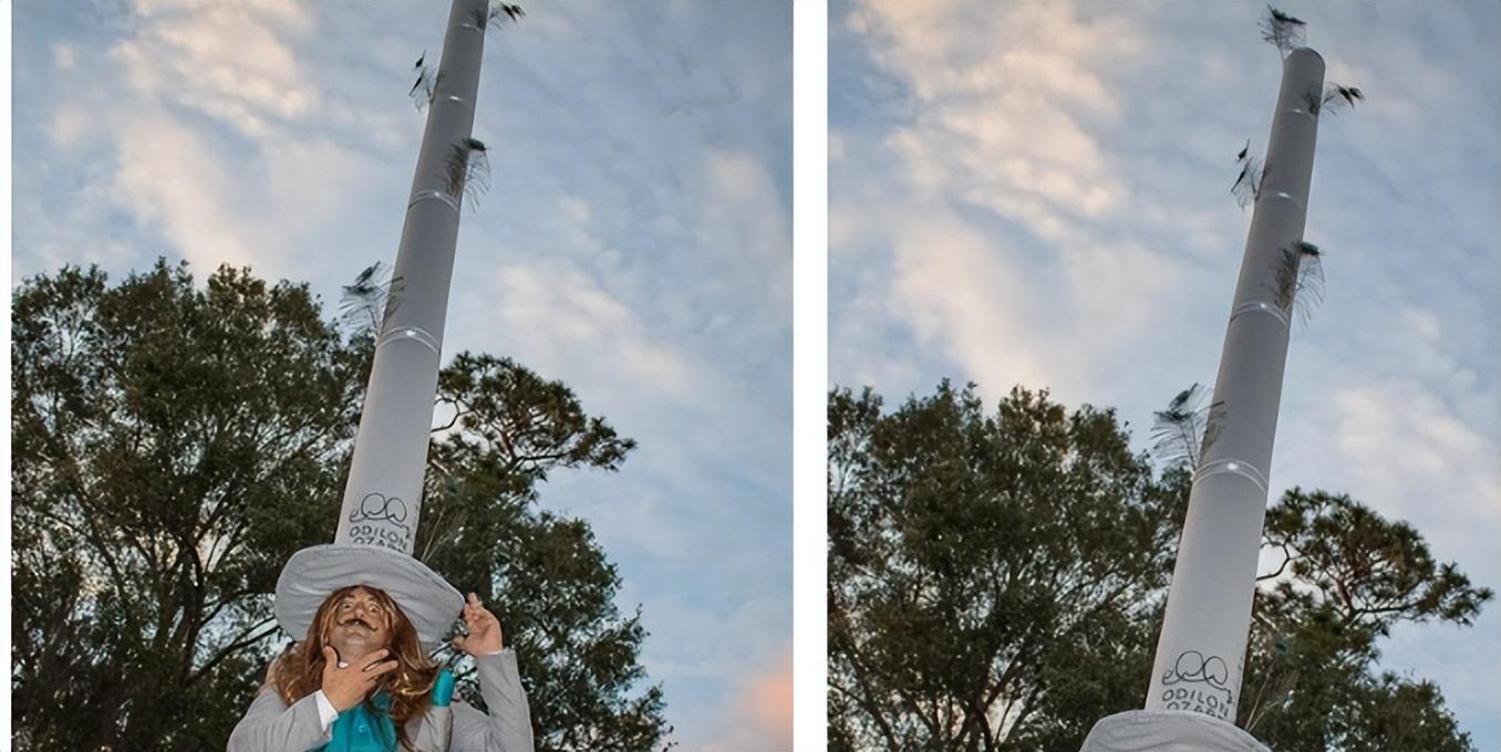 这位男子是一位女帽设计师,对大礼帽情有独钟。他设计了一顶浅灰色的帽子,高度达到了4.8米,成为了世界上最高的帽子之一。