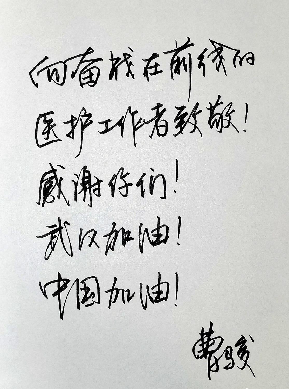 近日,不少明星除了捐款捐物,也都在给武汉应援,不少明星秀出了自己的字迹,但字体嘛,委实良莠不齐。其中有一幅字,吸引了小编的注意力,刚劲有力,字体大气。一看落款,居然是曹骏写的。