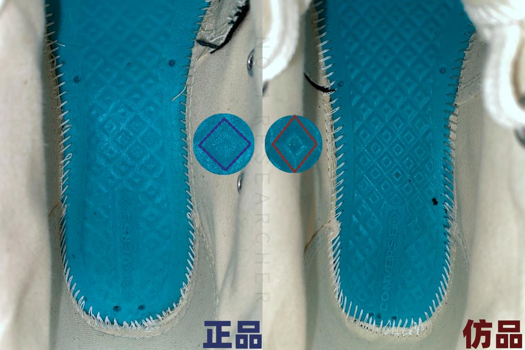 为了迎合本款“复古”的主题,因此正品中底是做旧的米黄色,而仿品则忽略了这个细节,颜色更偏白。